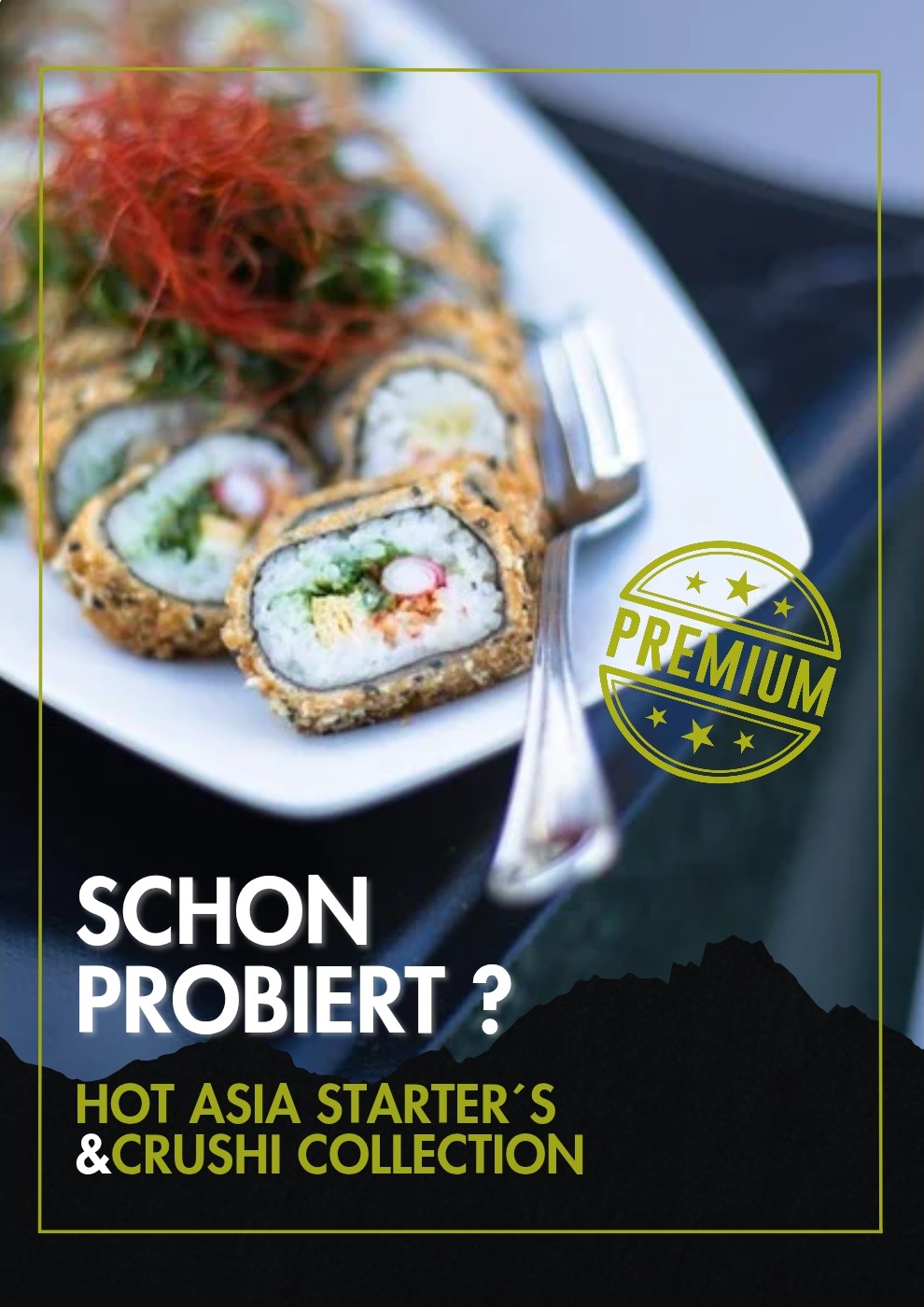 - Knuspriges Sushi(CRUSHI) , knusprig gebackene Teigtaschen (GYOZA) , Garnelen im Tempurateig
